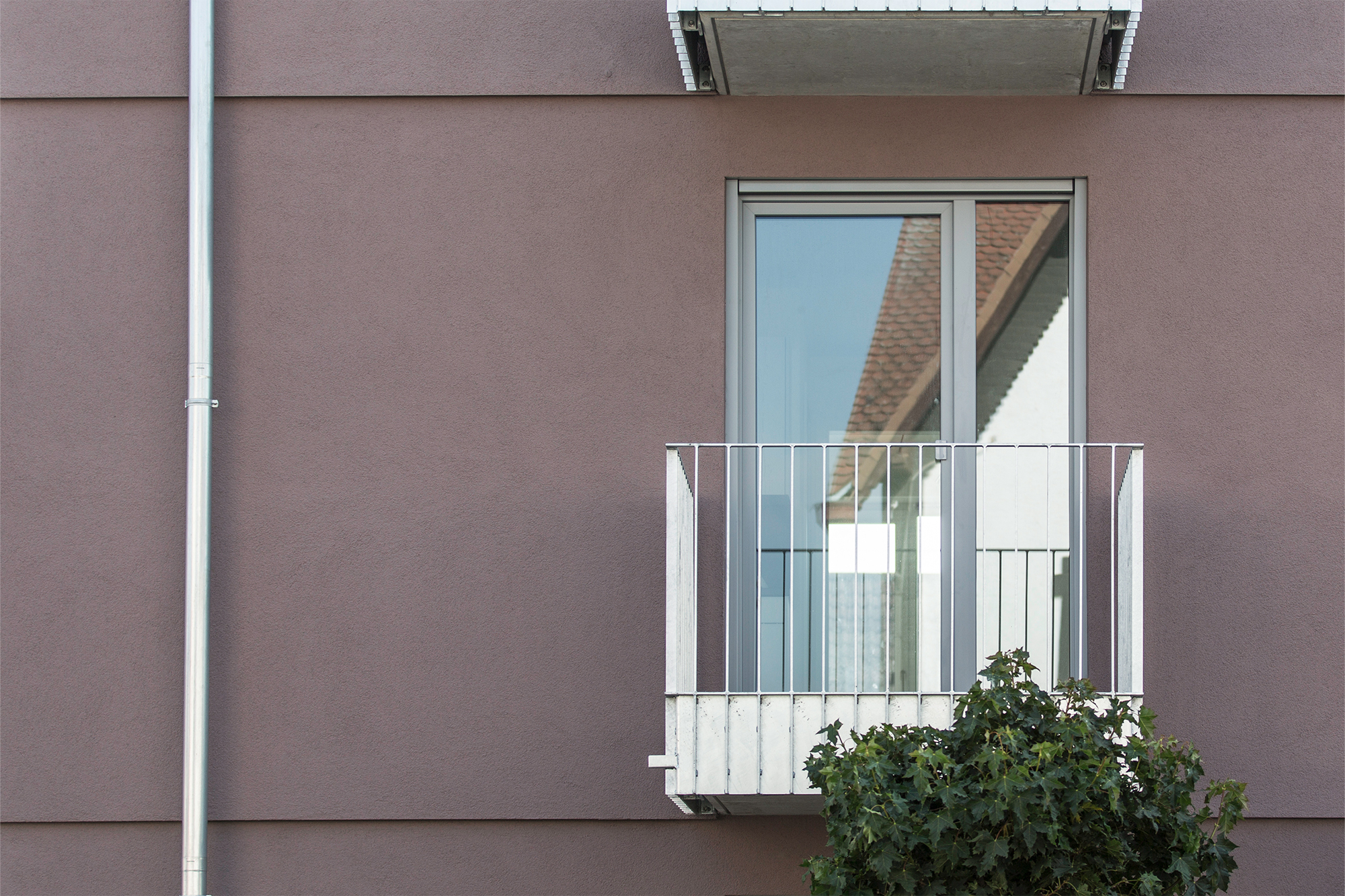 Der kantige Baukörper orientiert sich in der Höhe an der umliegenden Bebauung, wird jedoch durch die Aufstockung einer Penthouse-Wohnung mit einer nicht einsehbaren Dachterrasse besonders. Die Fassade wird durch dezente Vorsprünge gegliedert.