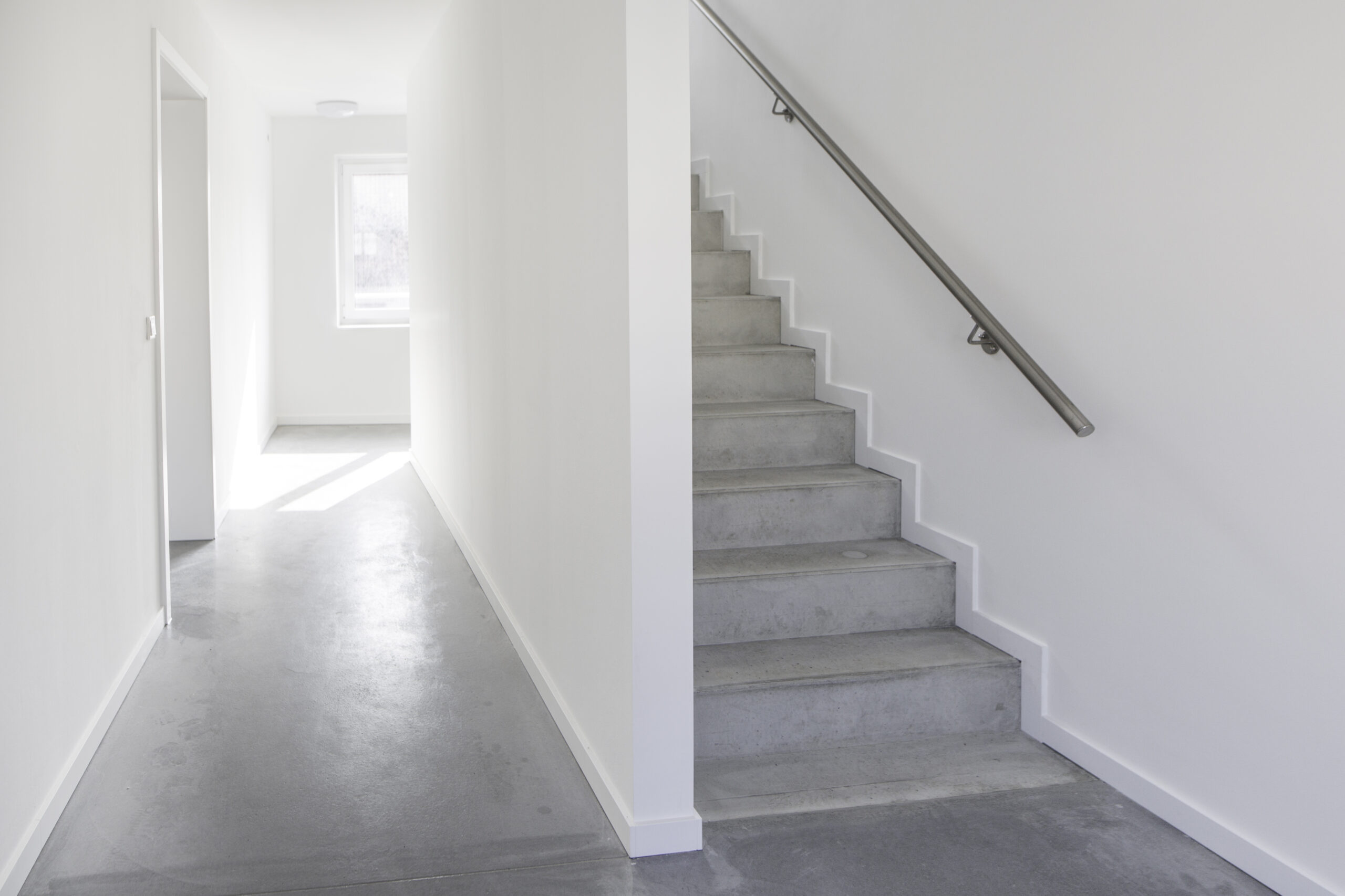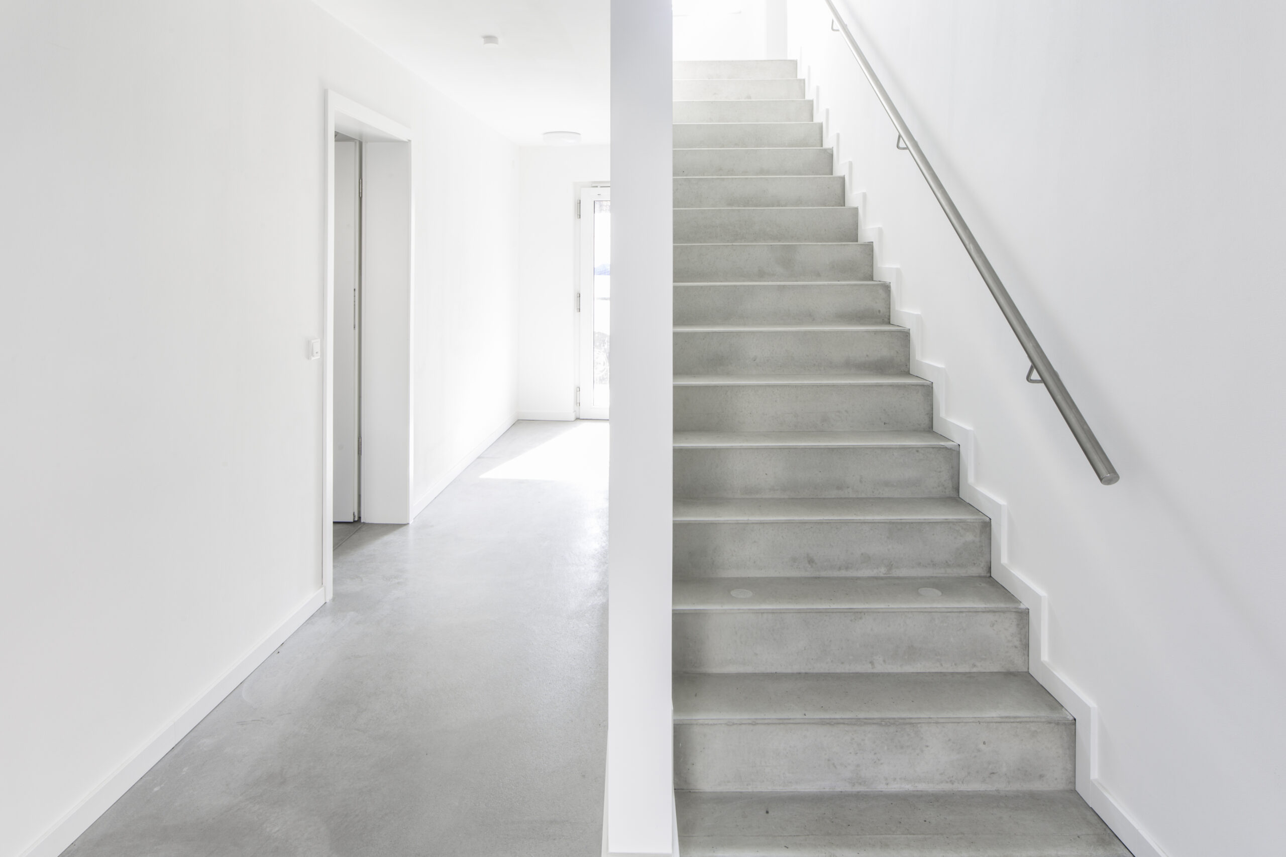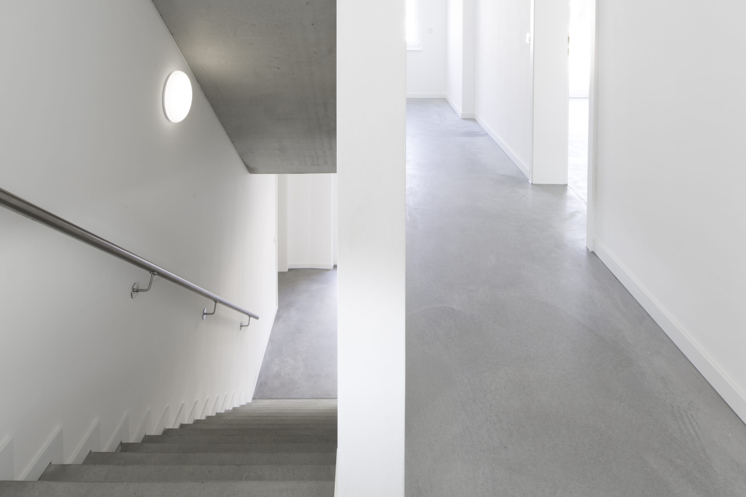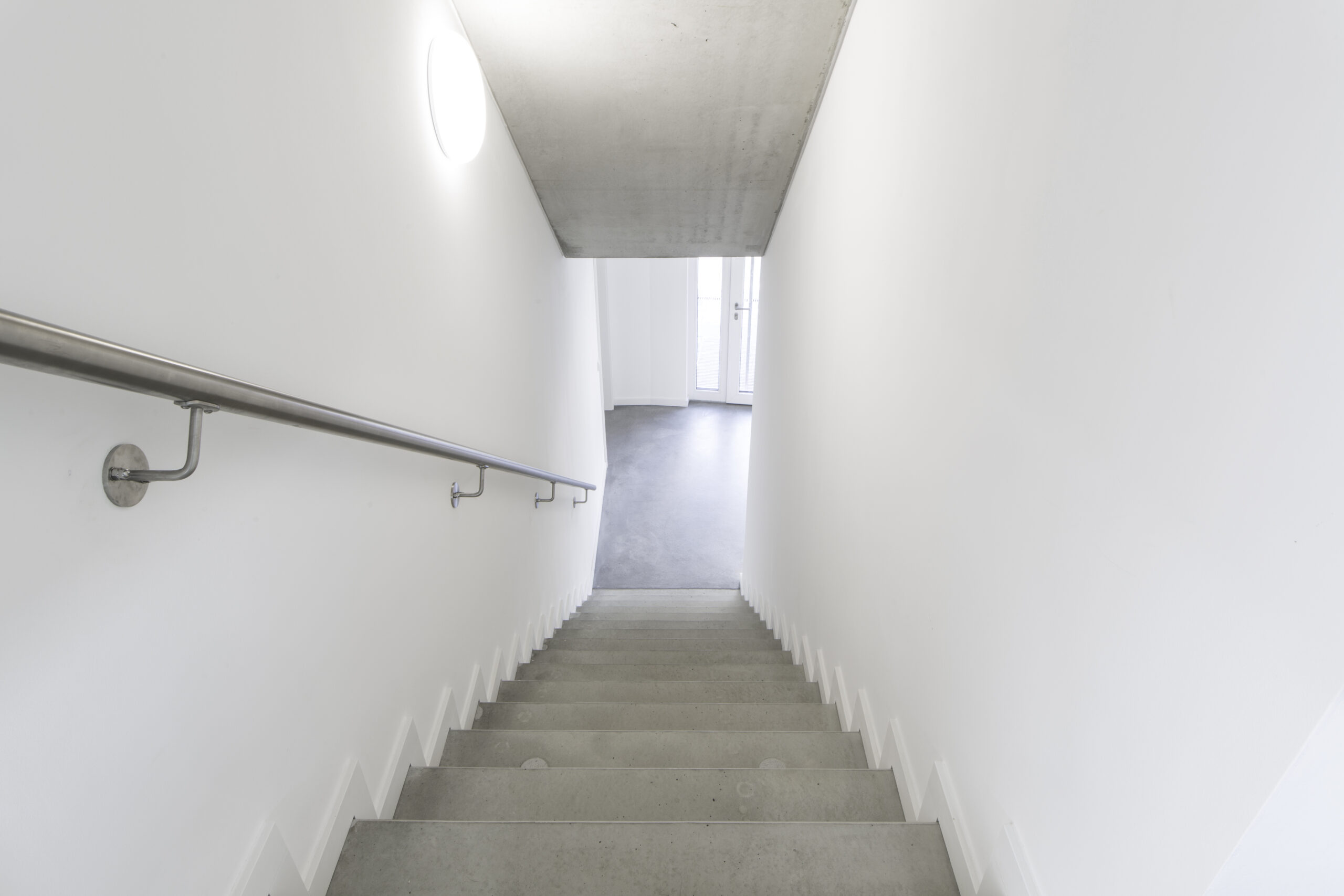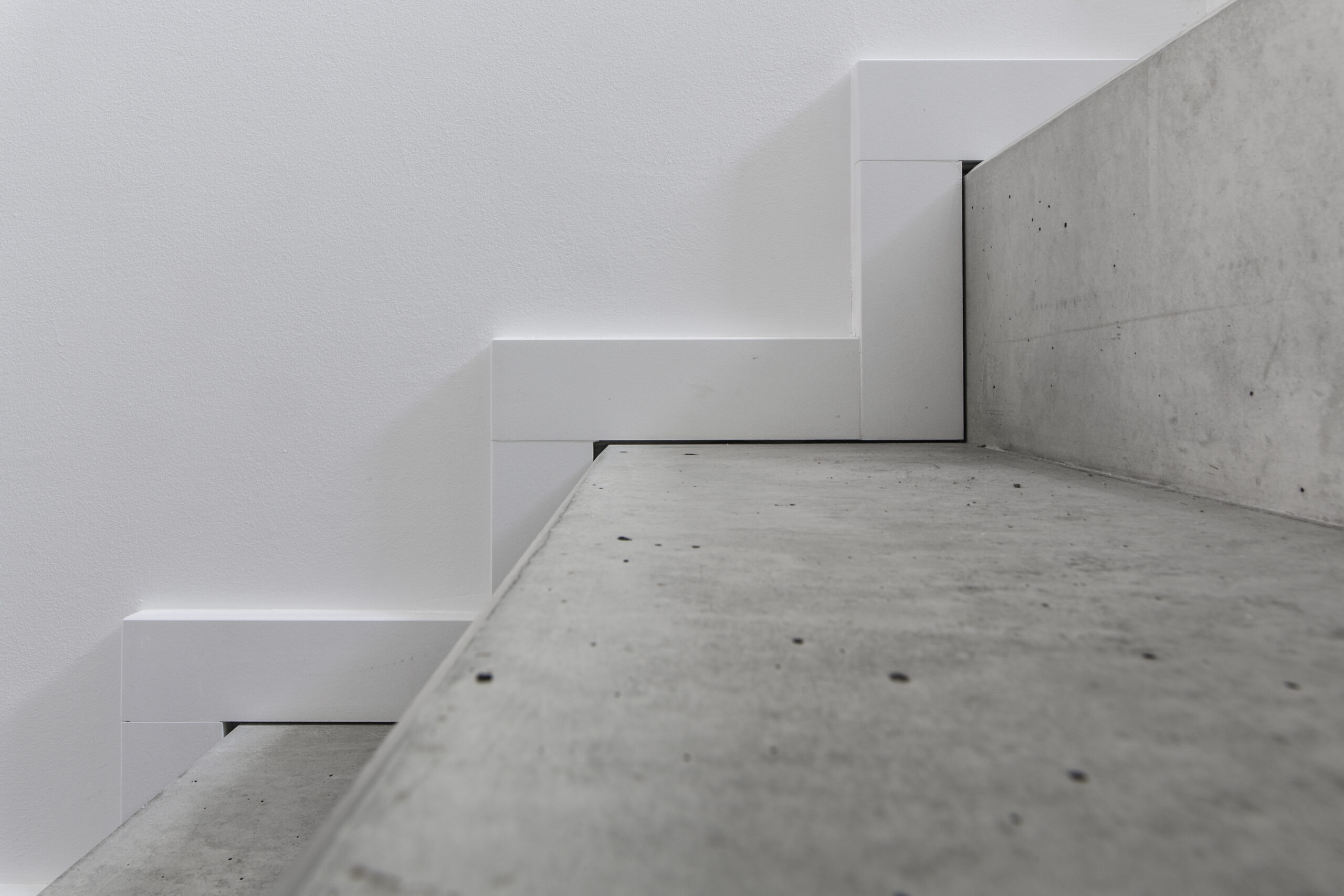 Durch die Reduktion der Materialien – auf Sichtbeton und weiße Oberflächen – entsteht ein wohltuendes und klares Erscheinungsbild.