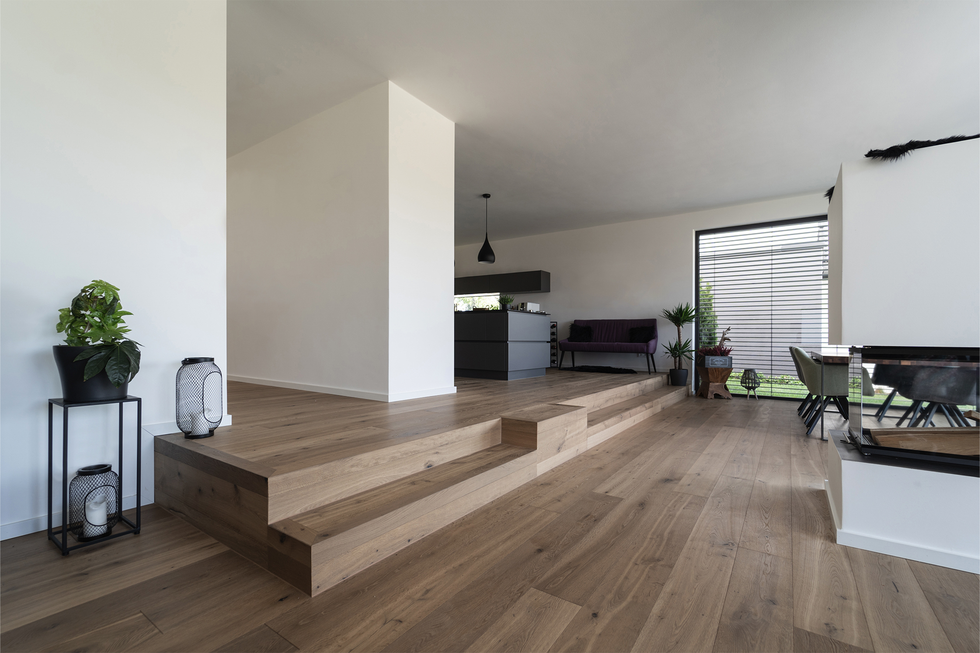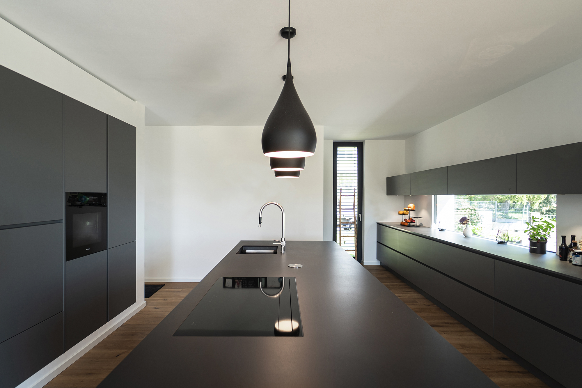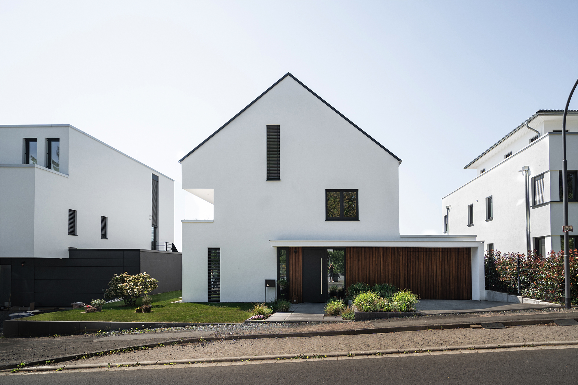 Der klassische Haustyp mit Satteldach weist eine zur Straße hin fast geschlossene Fassade auf und erscheint damit skulptural, eine mit Pappelholz verkleideter Eingangsbereich wirkt als einladende Geste. Raumhohe Verglasungen öffnen die Wohnräume großzügig zur Gartenseite.
