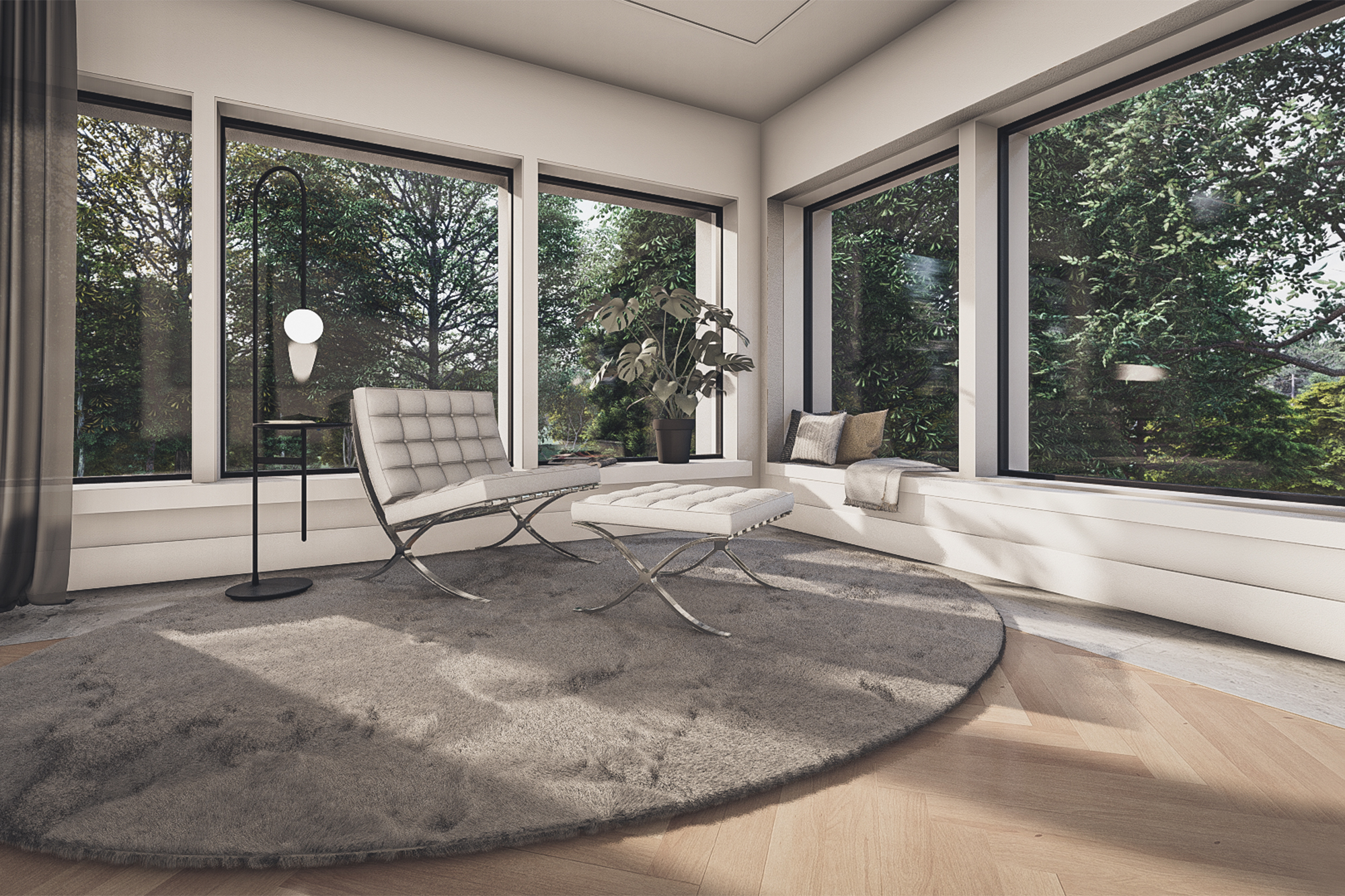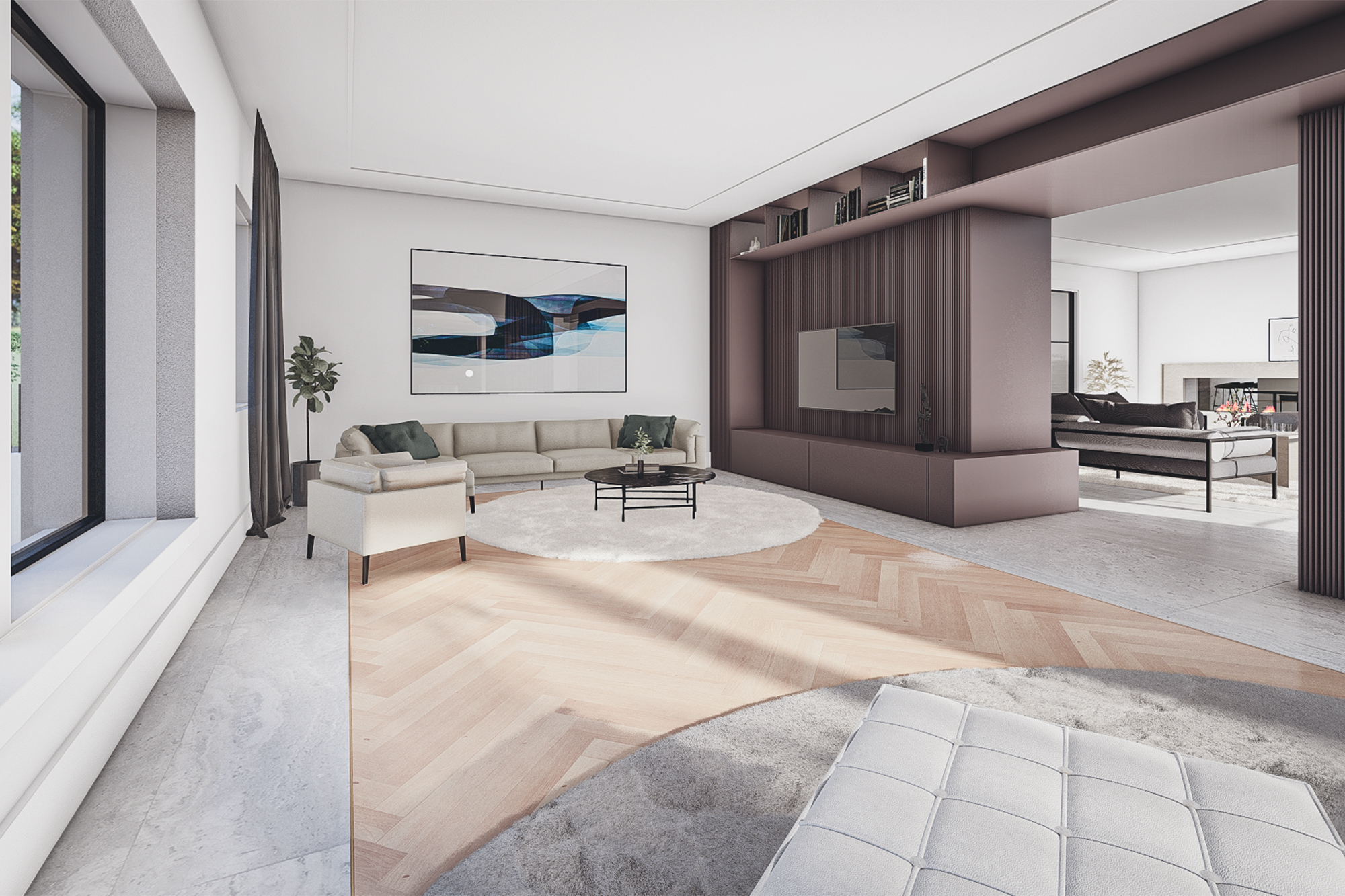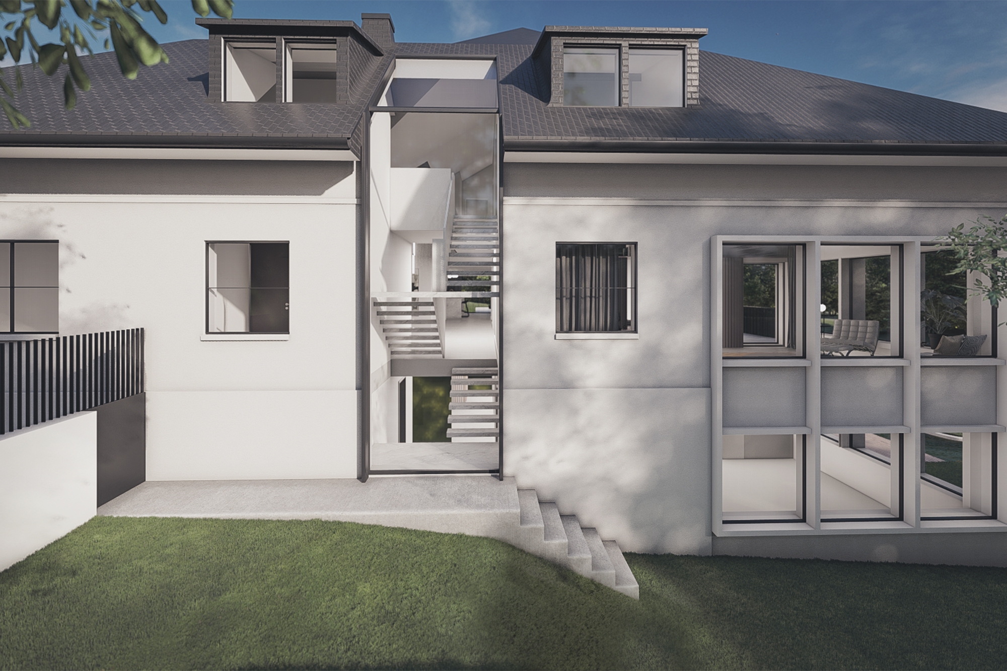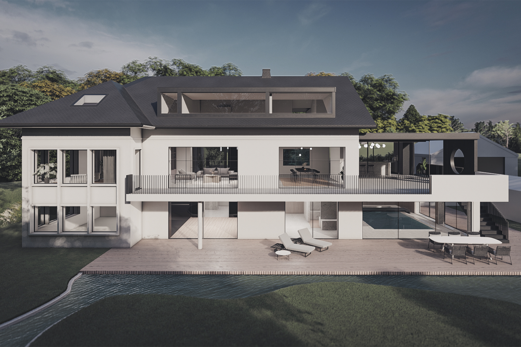 Im Zuge der Planung wurden die kleinteiligen Grundrisse aufgelöst, um helle Innenräume und lichtdurchflutete, fließende Raumübergänge zu schaffen. In die Fassadengestaltung im klassisch modernen Stil fügt sich der verglaste Anbau ein, sodass ein stimmiges Gesamtkonzept aus Architektur, Materialien und besonderen Ausstattungselementen entsteht.