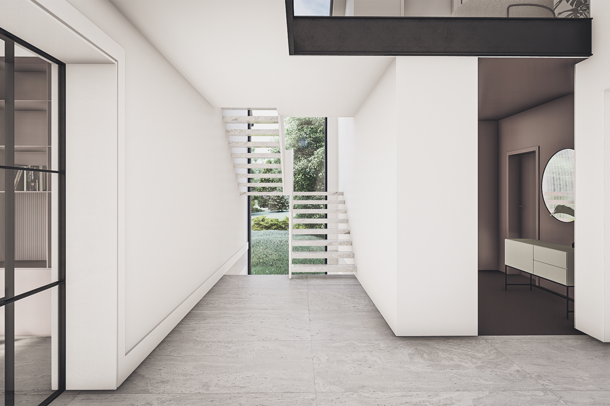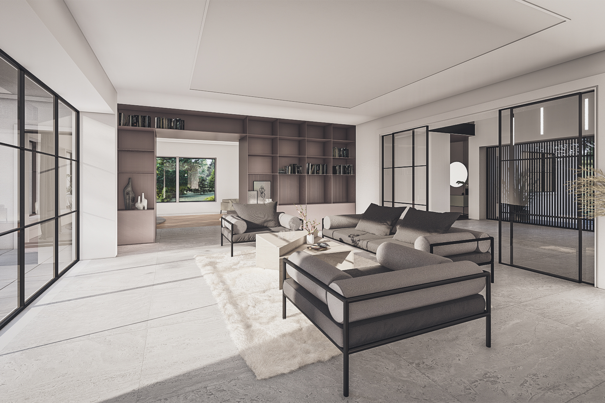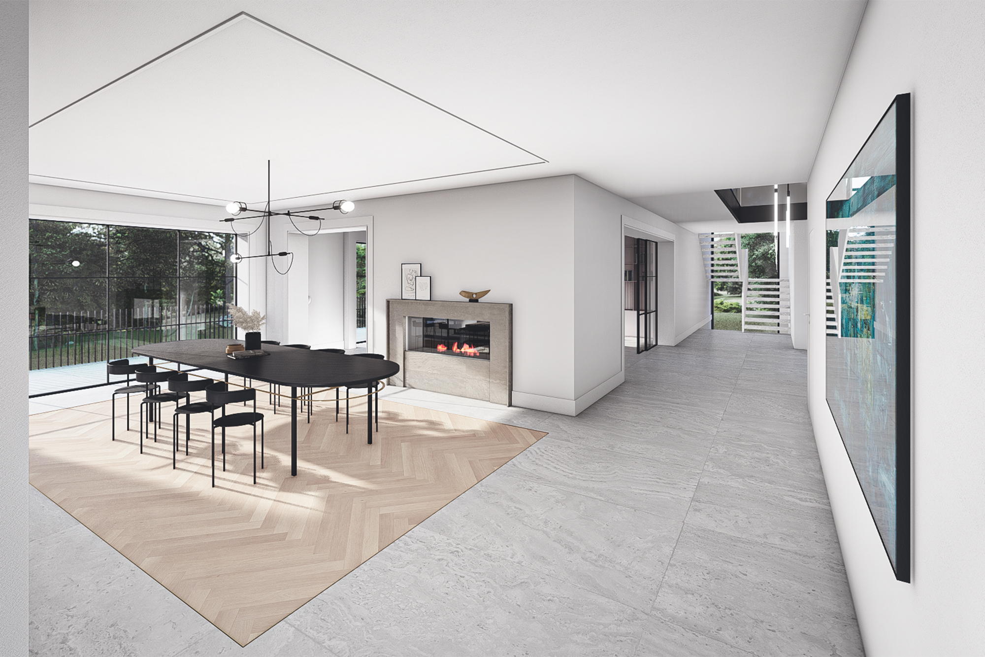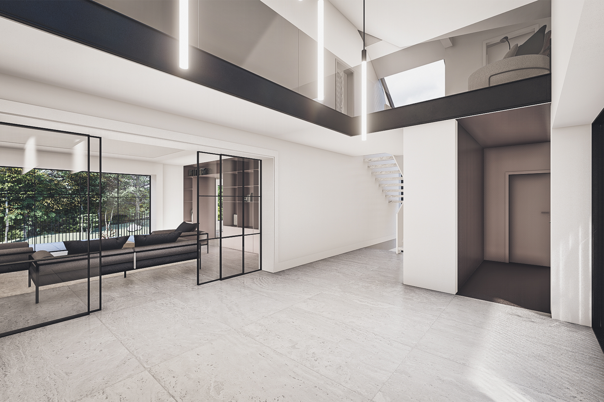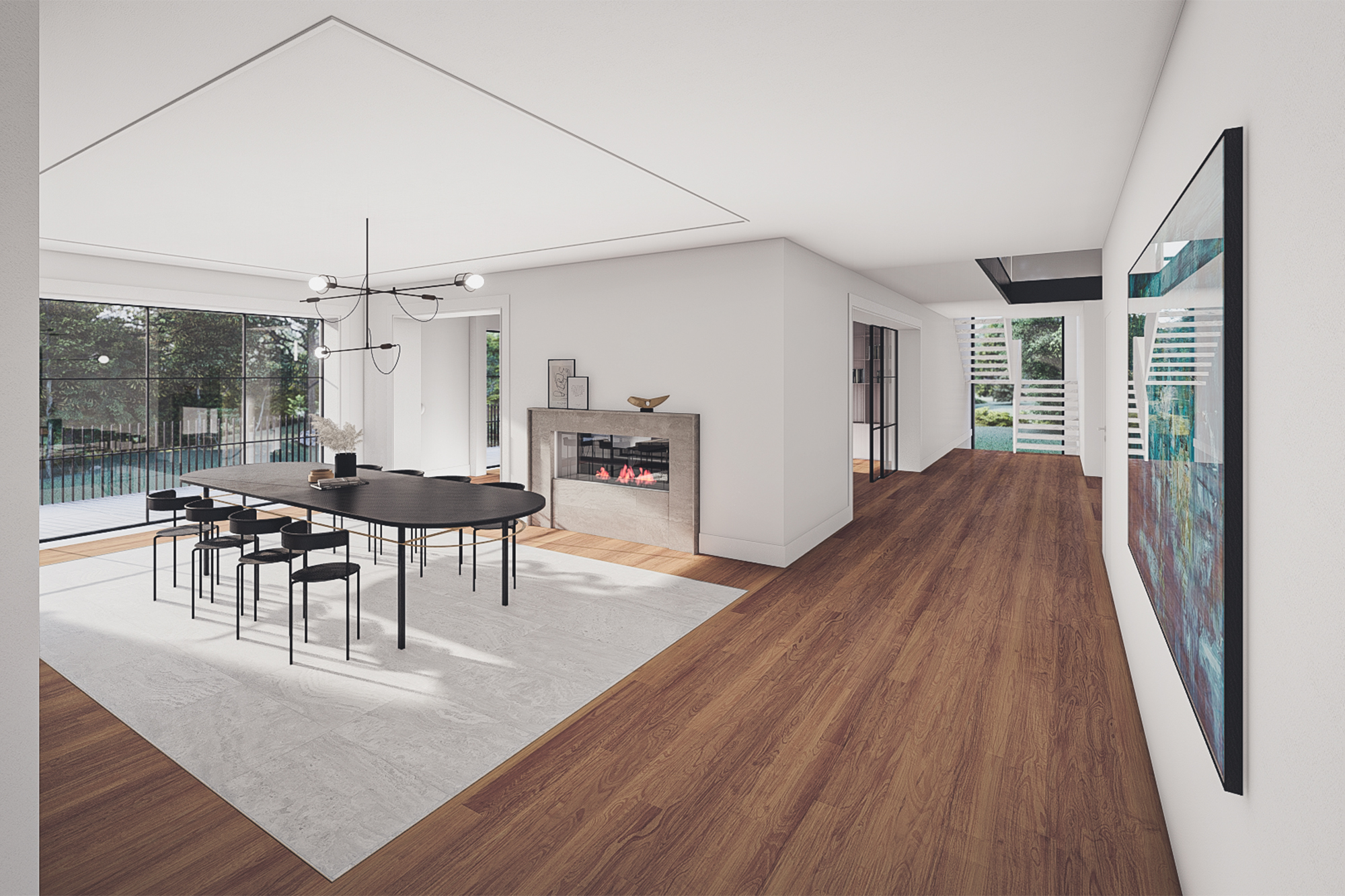 Im Zuge der Planung wurden die kleinteiligen Grundrisse aufgelöst, um helle Innenräume und lichtdurchflutete, fließende Raumübergänge zu schaffen. In die Fassadengestaltung im klassisch modernen Stil fügt sich der verglaste Anbau ein, sodass ein stimmiges Gesamtkonzept aus Architektur, Materialien und besonderen Ausstattungselementen entsteht.