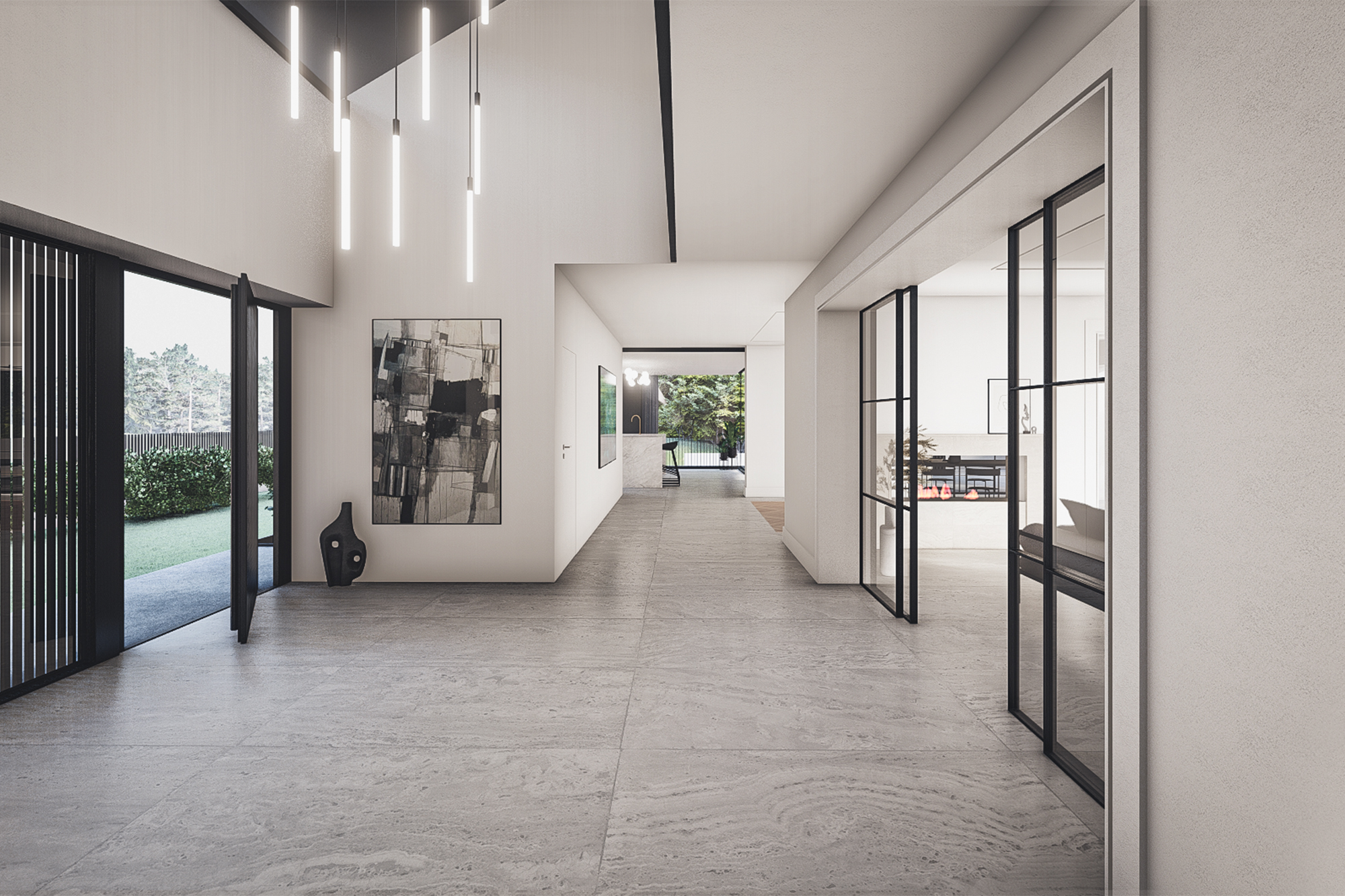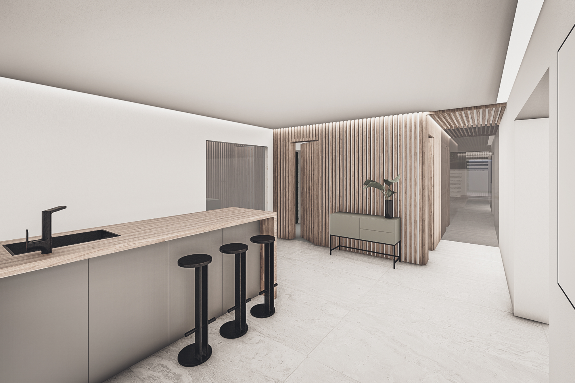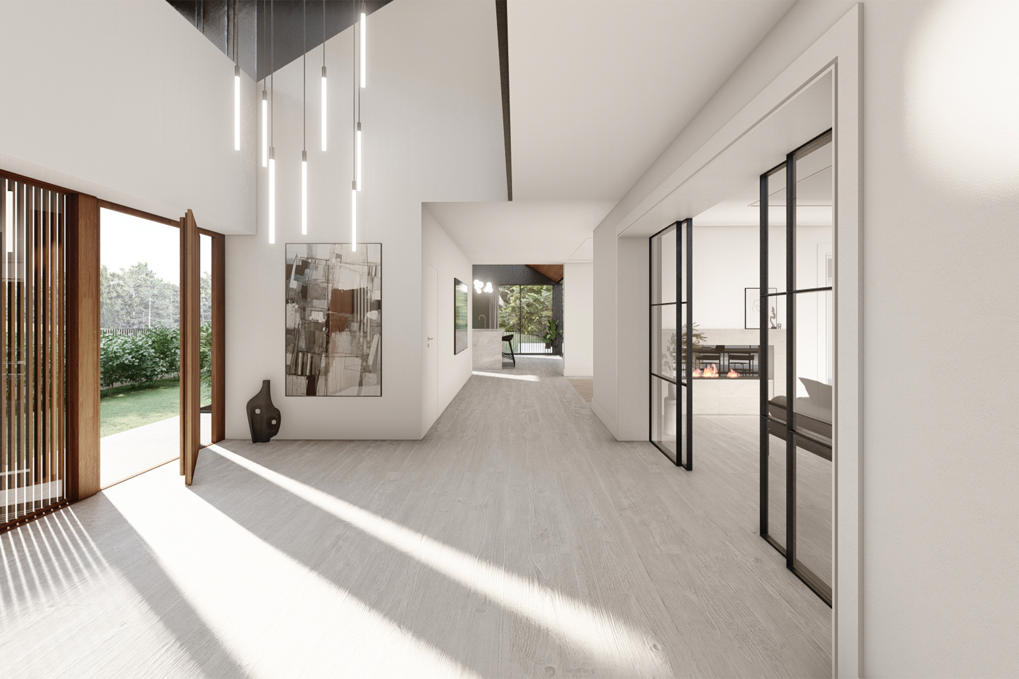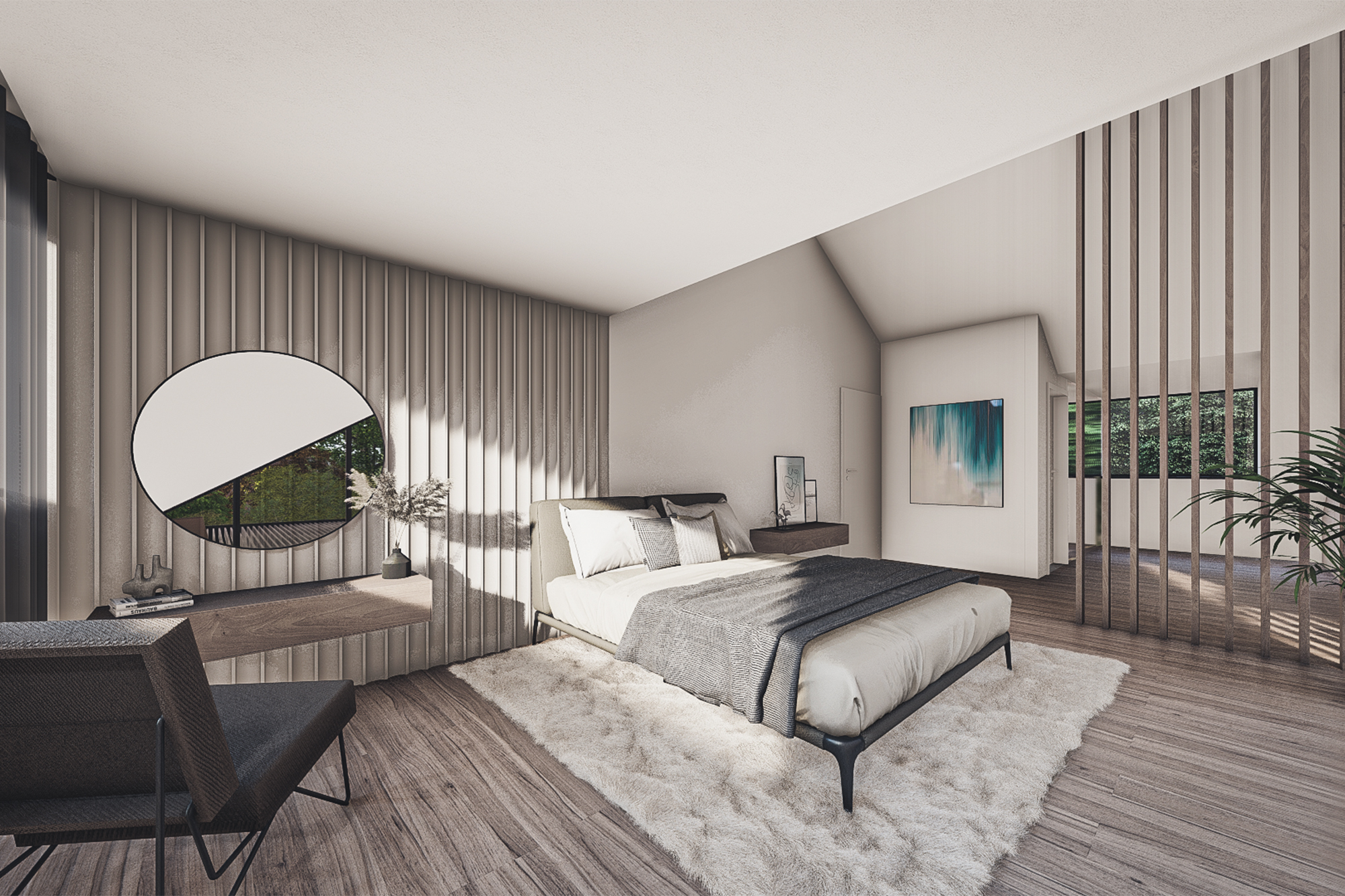 Im Zuge der Planung wurden die kleinteiligen Grundrisse aufgelöst, um helle Innenräume und lichtdurchflutete, fließende Raumübergänge zu schaffen. In die Fassadengestaltung im klassisch modernen Stil fügt sich der verglaste Anbau ein, sodass ein stimmiges Gesamtkonzept aus Architektur, Materialien und besonderen Ausstattungselementen entsteht.