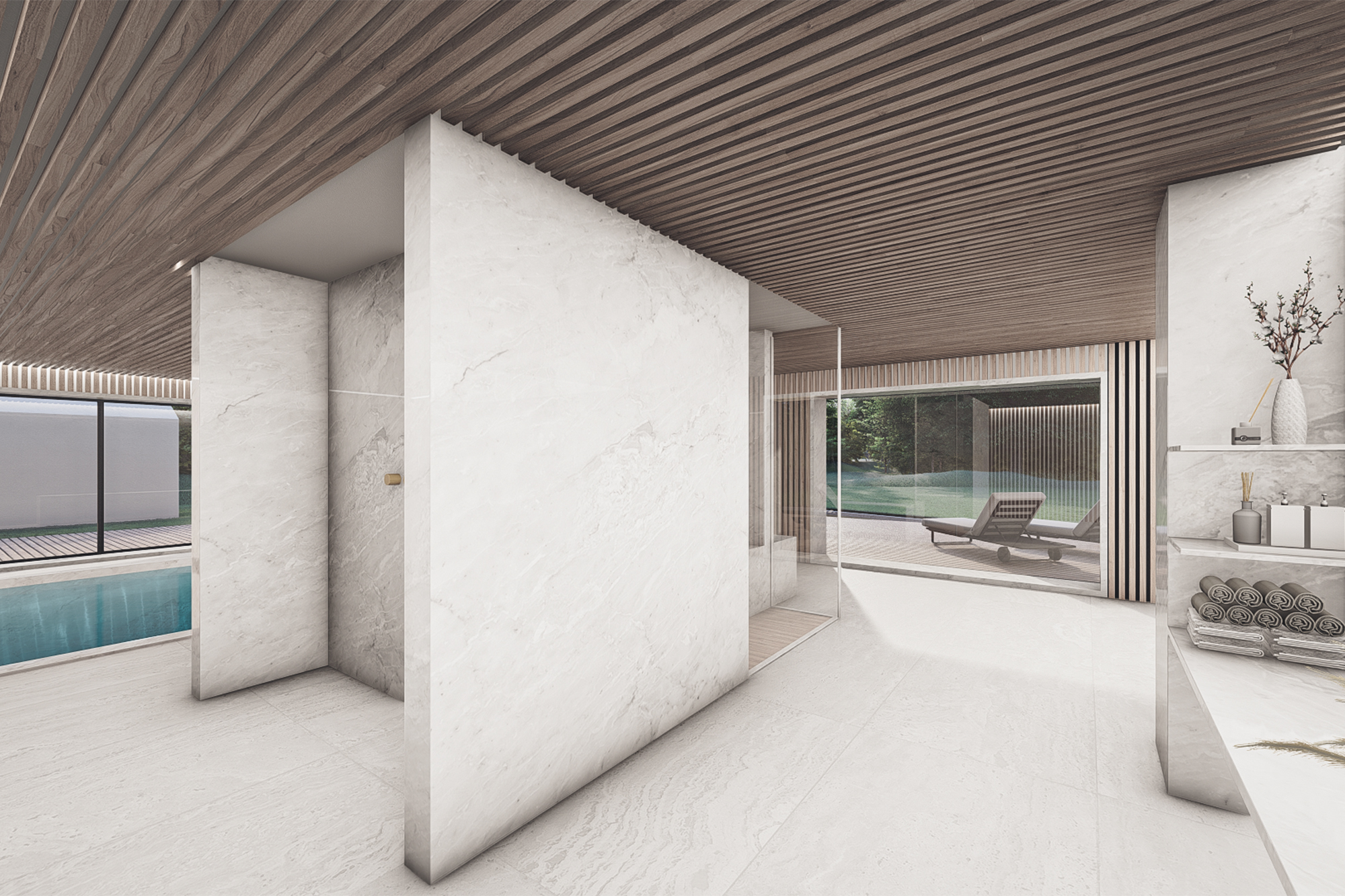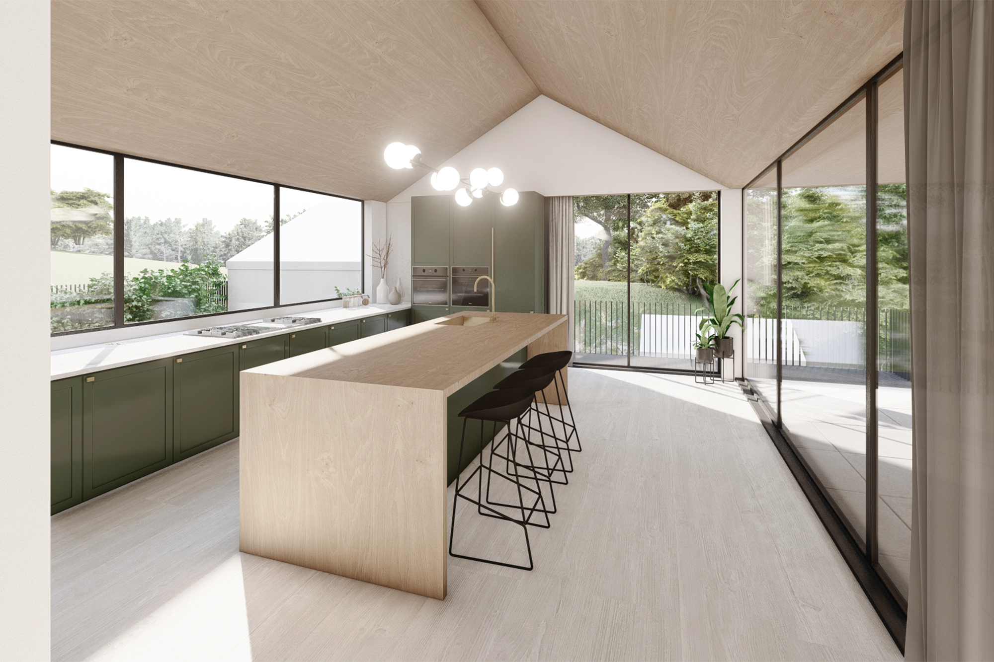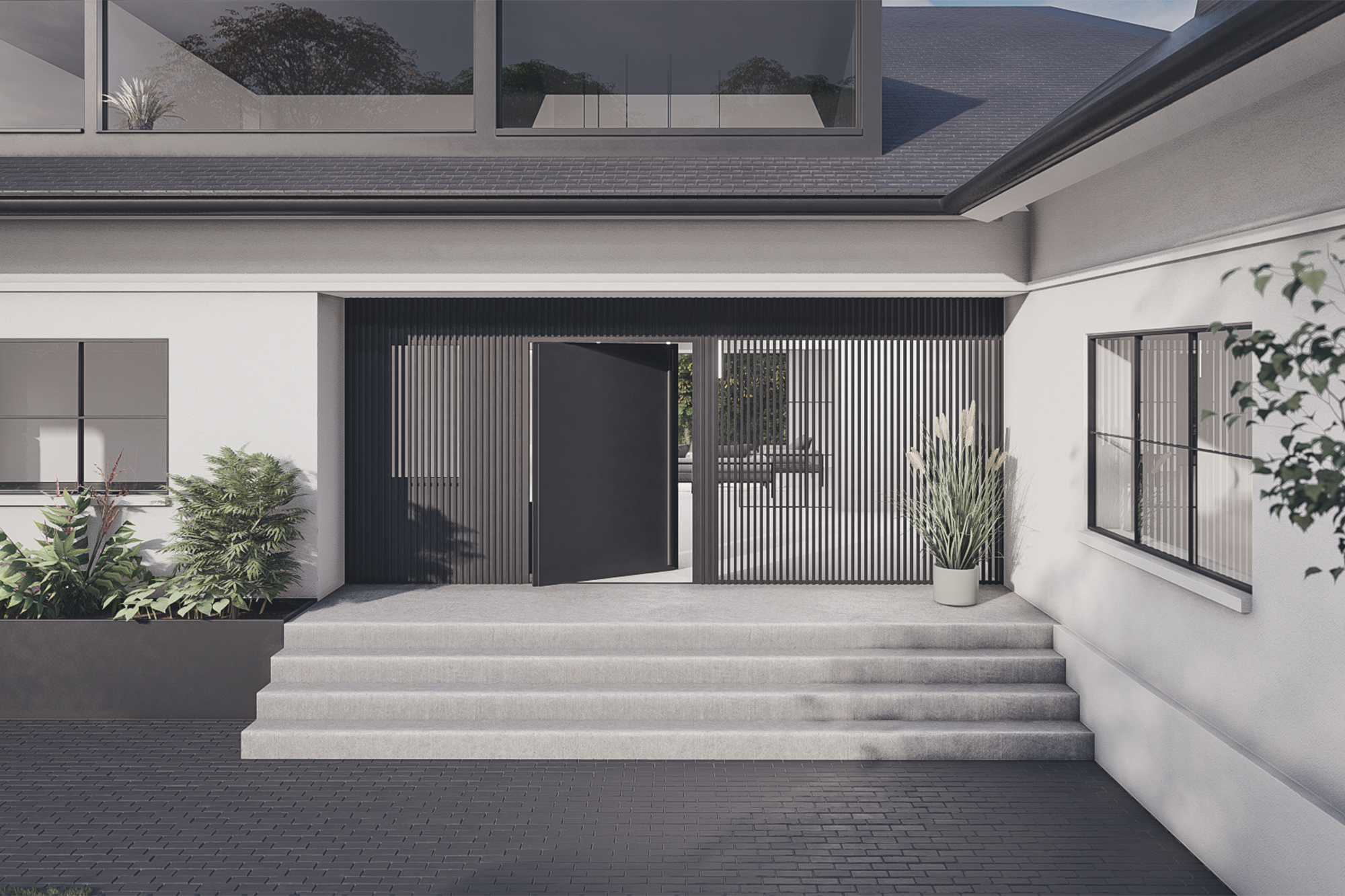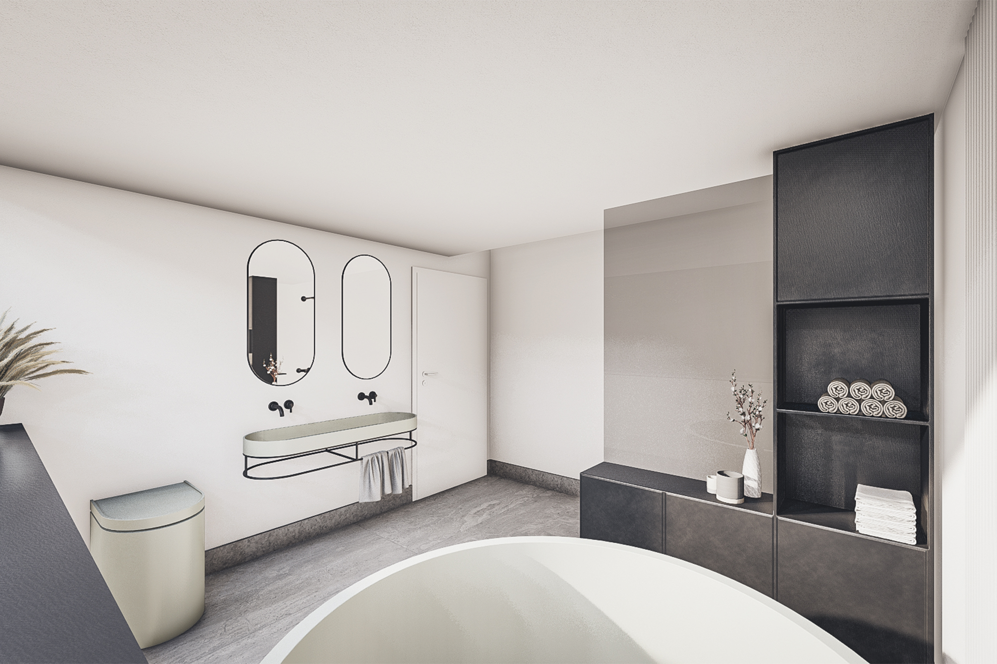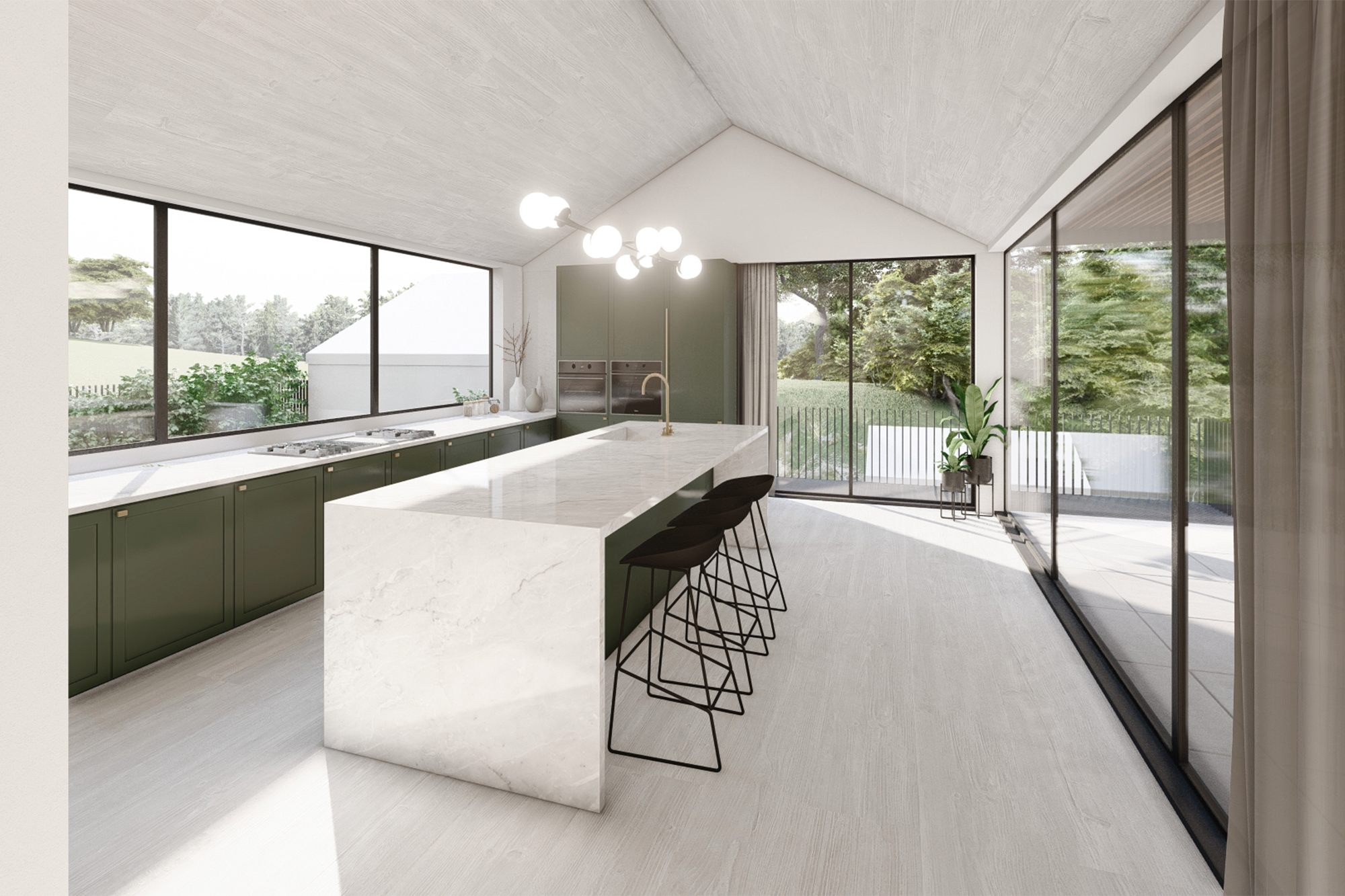Im Zuge der Planung wurden die kleinteiligen Grundrisse aufgelöst, um helle Innenräume und lichtdurchflutete, fließende Raumübergänge zu schaffen. In die Fassadengestaltung im klassisch modernen Stil fügt sich der verglaste Anbau ein, sodass ein stimmiges Gesamtkonzept aus Architektur, Materialien und besonderen Ausstattungselementen entsteht.